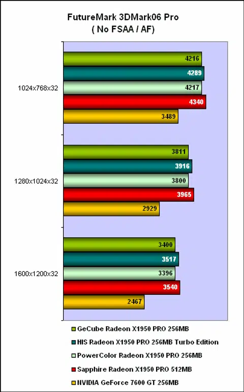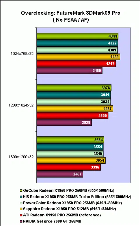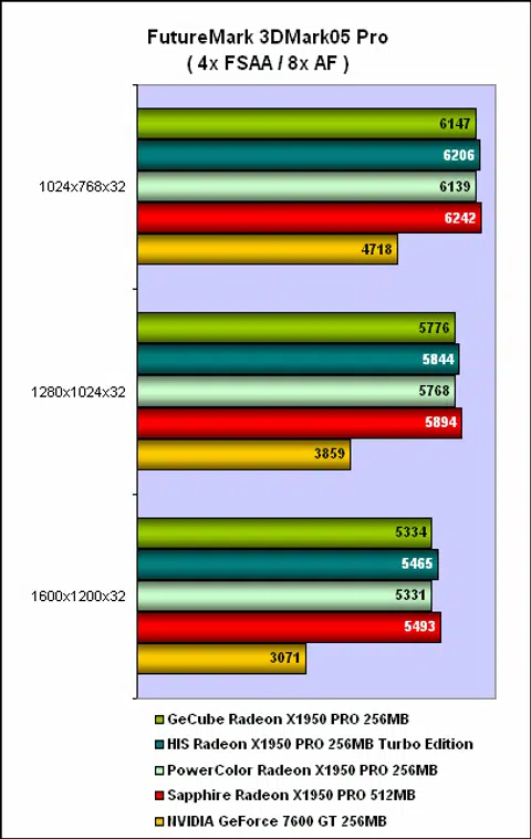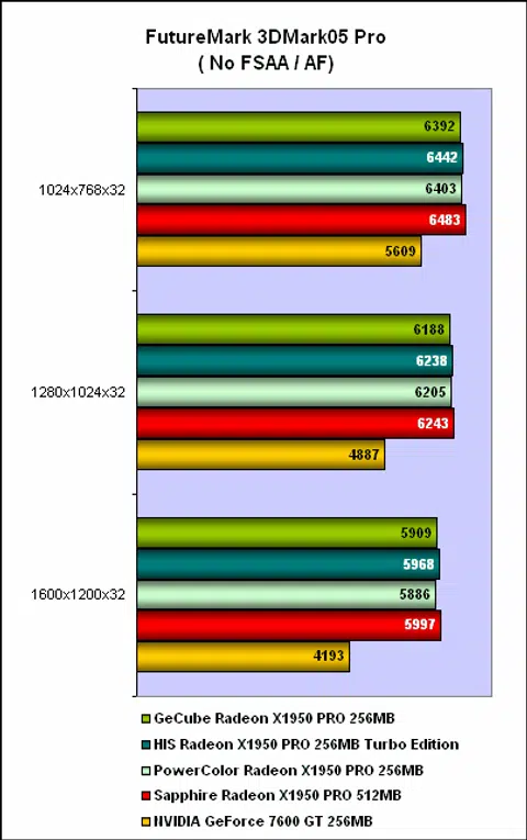 All thanks to its 512MB frame buffer, the Sapphire was just able to narrowly secure the top position in 3DMark over the HIS Turbo Edition. Every card did quite similarly though, regardless of the clock speeds and the 1 - 2% differences were less than we expected. The predictably wide performance gap between the Radeon X1950 PRO and the GeForce 7600 GT also showed that ATI is now on top of the AGP food chain with the fastest offering yet.