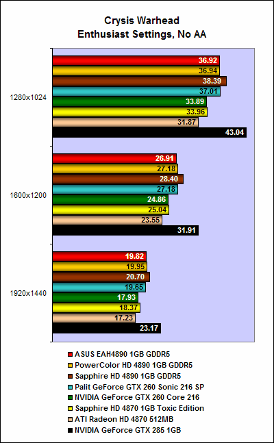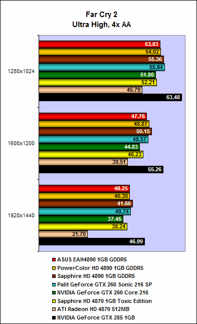 The super-intensive and resource hungry CryENGINE really put our cards to the test and given the similar clock speeds of the ASUS EAH4890 and PowerColor HD 4890, it is not surprising to see the both of them recording nearly identical results. The Sapphire HD 4890, thanks to its slightly higher clock speeds, was a tad faster. From the graph, we can also see that the new HD 4890 offers slightly better performance than the GTX260+ and HD 4870. It was no match, however, for the GTX 285.
