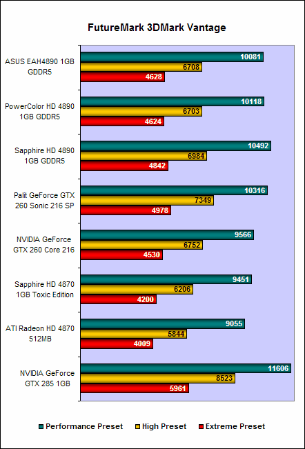 Coming to Vantage, we noted once again that the Radeon HD 4890 managed better scores than its rival, the GTX 260+. They were also substantially faster than even the factory-overclocked Sapphire HD 4870. However, our threesome met their match in the factory-overclocked Palit GTX 260+ Sonic, and was expectedly beaten by the GTX 285.