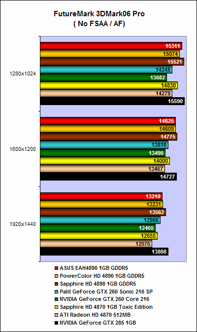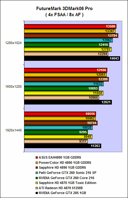 Our three Radeon HD 4890 cards started brightly in 3DMark06 by posting scores that were significantly better than the GTX 260+. In fact, it was even almost a match for the fearsome GTX 285. Also, we can see that the HD 4890 outperformed the older HD 4870 by about 5% across all resolutions and test settings.