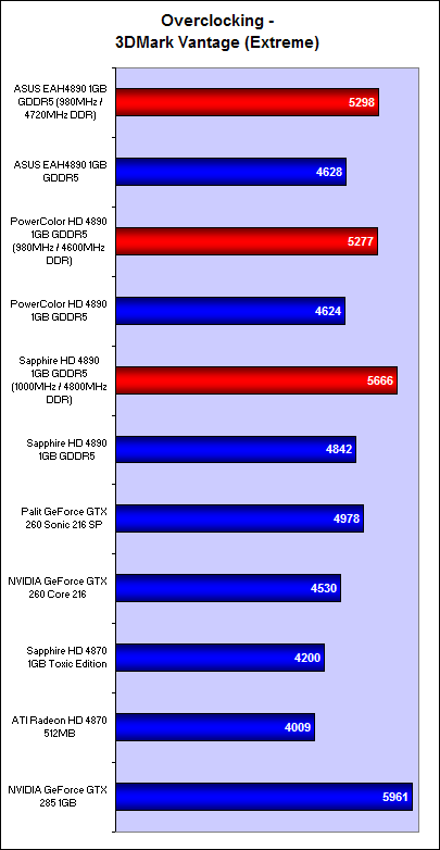 Using ASUS' SmartDoctor application, we managed to tweak the ASUS EAH4890 graphics card's voltage settings from 1.312V to 1.404V and this allowed it to achieve a maximum overclock of 980MHz at the core and 4720MHz DDR at the memory, giving us a 14% boost in 3DMark Vantage scores.