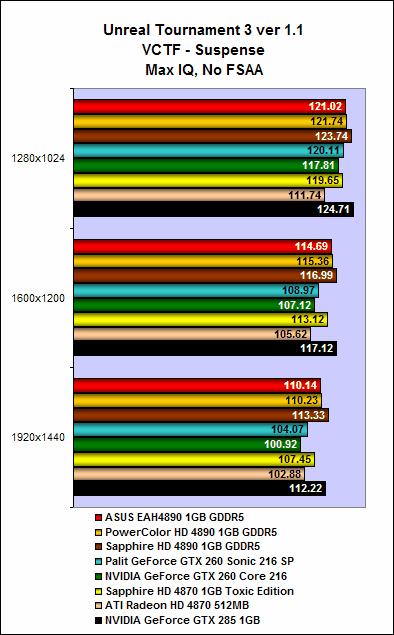 Unreal Tournament 3 went in favor of the Radeon HD 4890. The factory-overclocked Sapphire HD 4890 was the leader of the trio and it was about 5% to 10% quicker than a reference GTX 260+. In fact, its scores could easily rival that of GTX 285.