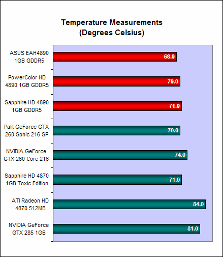 High operating temperatures have traditionally plagued ATI's Radeon HD 4800 series of cards. Reference cards, armed with only the reference cooler, could easily reach temperatures of 80 degrees Celsius when taxed with a heavy load. Hence, we were pleasantly surprised to find that our trio of HD 4890 cards topped out at around 70 degrees Celsius, the same as the Sapphire HD 4870 Toxic Edition with its customized Vapor-X cooler. There is a trade-off, however, as all three cards were particularly noisy. It sounded as if their coolers were all working overtime to keep the card cool.
