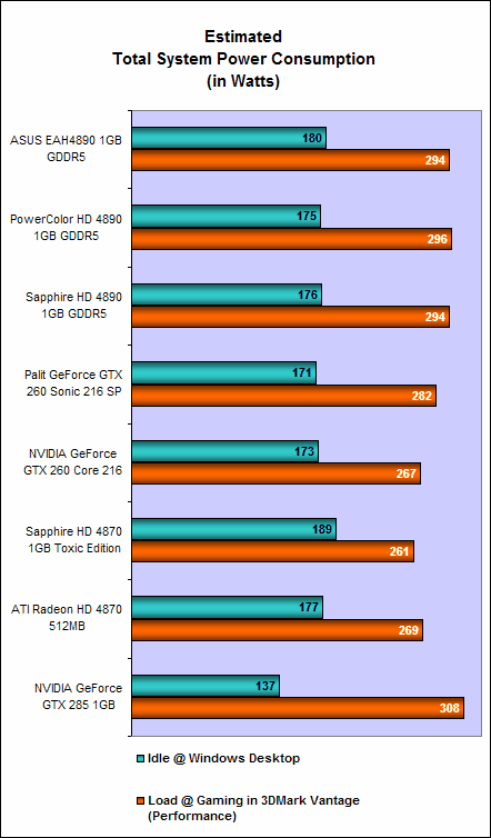 There were rumors that the new Radeon HD 4890 would be a more efficient card and from its GPU enhancements, we expected that as well. Sadly, that attribute didn't show up in our tests, no doubt due to the HD 4890's correspondingly higher clocks. In fact, our findings indicate that new HD 4890 is a more power-hungry card at idle than its predecessor and even the competition. This is still one area where ATI is still particularly weak in.