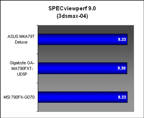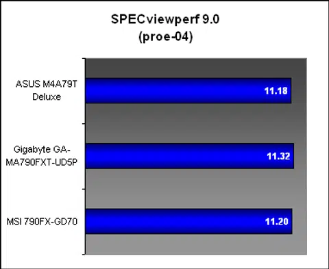 As expected, the results in SPECviewperf 9.0 were too close to call between the three motherboards. Since both the graphics and memory subsystems are tested in this benchmark, it's safe to say that if you're looking for performance alone, any of these boards will do fine.