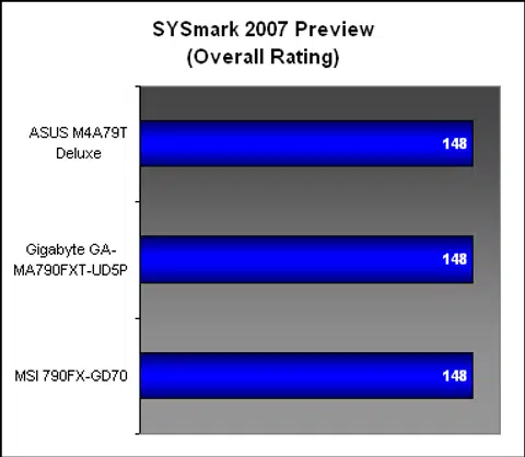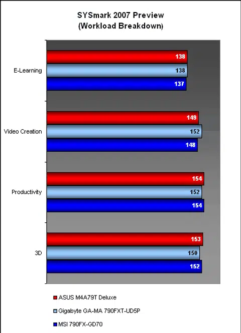While the individual breakdowns of the various subsections in SYSmark 2007 had some minor variations, the overall system score for the three boards were identical. Hence we had to examine the breakdown to find out their strengths and weaknesses. The Gigabyte for instance, had the slight edge in Video Creation, but lost ground to the other two in 3D and Productivity. Users however are unlikely to find any discernible differences between the boards when running their applications.