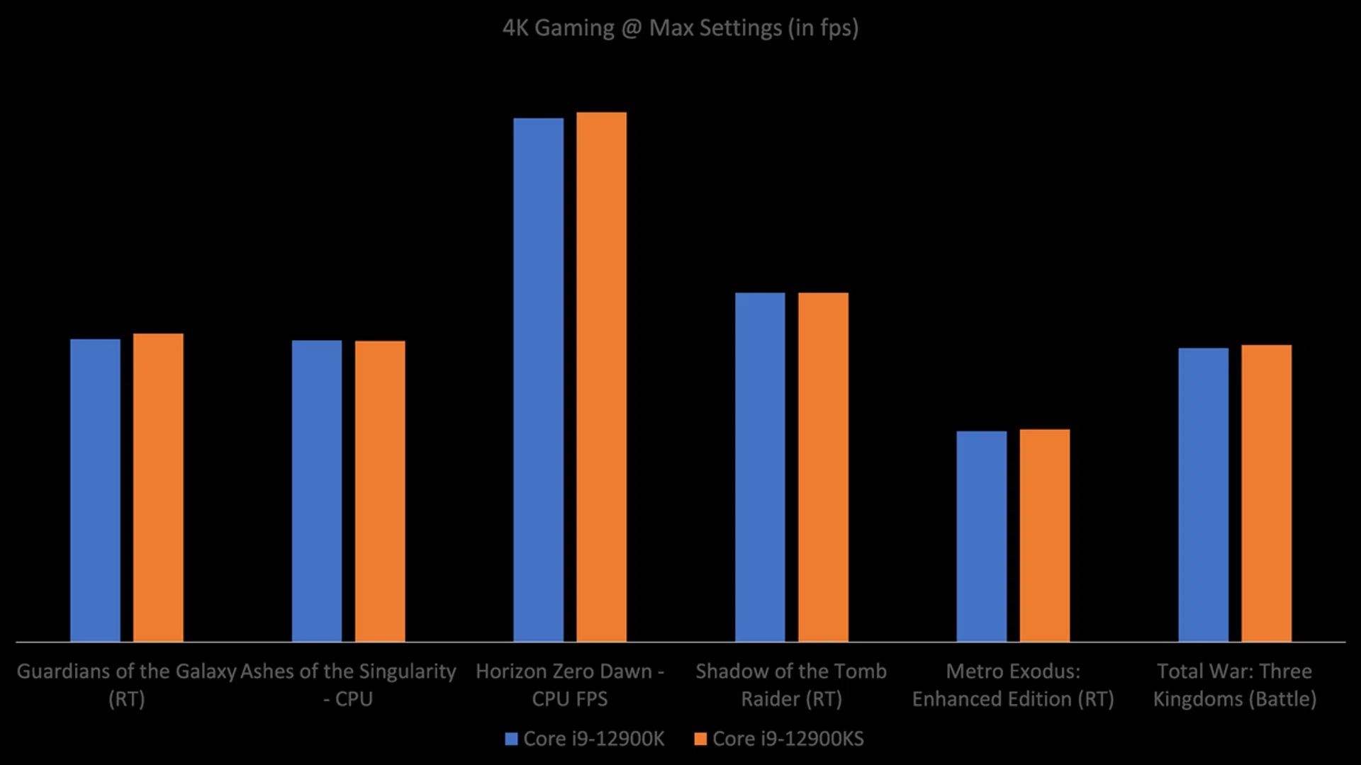 The reverse is also true at higher resolutions when the GPU takes more time to process the higher data load (more textures, etc..) and becomes the bottleneck. With 1440p, we start to see this happening, where the gains – albeit marginal ones – scored by the i9-12900KS earlier are pared down. Almost equal, even. Then in the 4K benchmark results, we can see how both processors achieved performance parity because, at such high-resolution, it’s the graphics card you use that matters more.