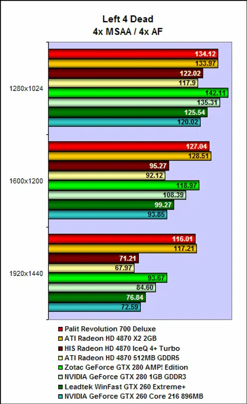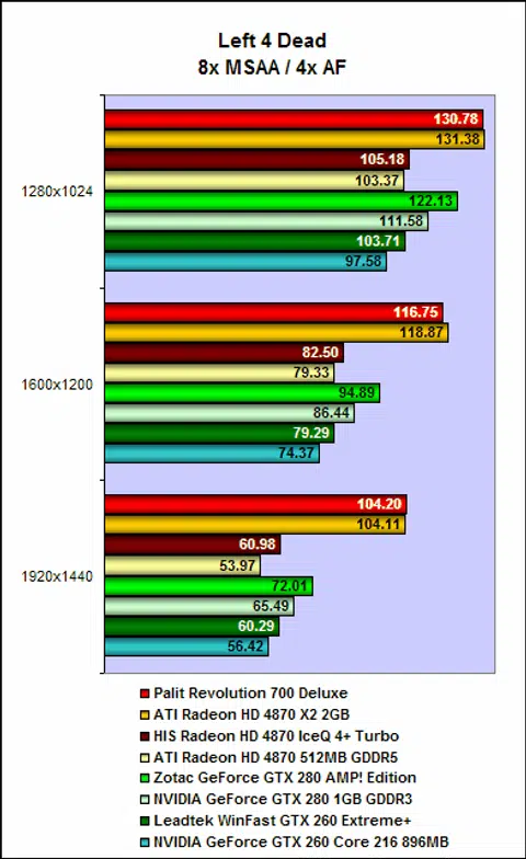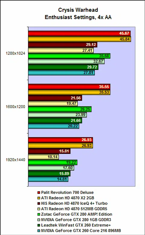 The Palit Revolution 700 Deluxe, with its 400MHz DDR memory overclock continues to disappoint by posting scores that were no different from a reference Radeon HD 4870 X2. Thankfully, the HIS Radeon HD 4870 IceQ 4+ Turbo did better, obtaining scores that were on average about 5% above a reference Radeon HD 4870. It managed its biggest jump on our highest setting, but that could be due to the fact that it has a frame buffer size that is twice as large.