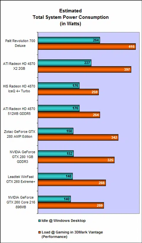 These cards are not going to win any green awards and it shows. None of the cards here managed to stand out and the lowest reading recorded was a still a considerable 259W at load. The highest, if you are wondering, goes to the Palit Revolution 700 Deluxe, which clocked an incredible 416W at load. The NVIDIA cards didn't do any better either, with the Zotac GeForce GTX 280 AMP! Edition and Leadtek WinFast GTX 260 Extreme+ managing 342W and 288W at load respectively. If it's any consolation, the NVIDIA cards recorded the lowest power draw at idle. Load power can't really be compared because each of them cater to different performance needs, but it does give you a good picture of the hidden costs of owning higher powered cards.