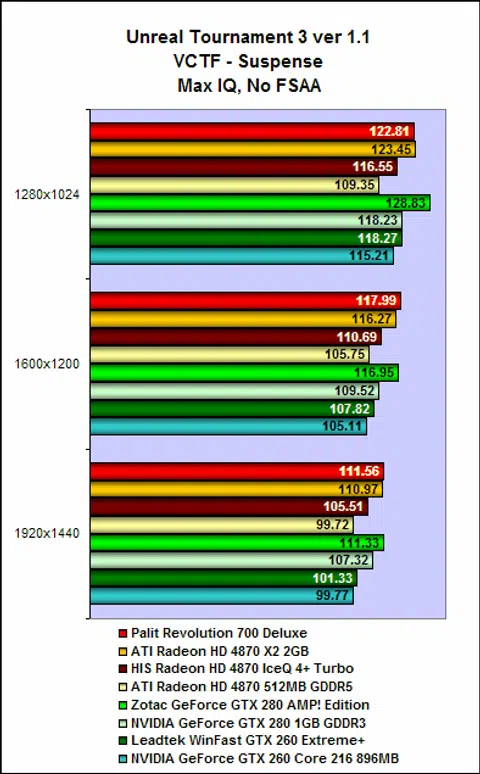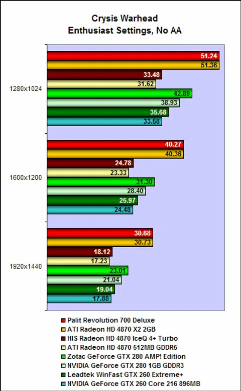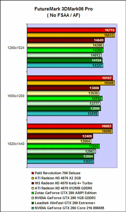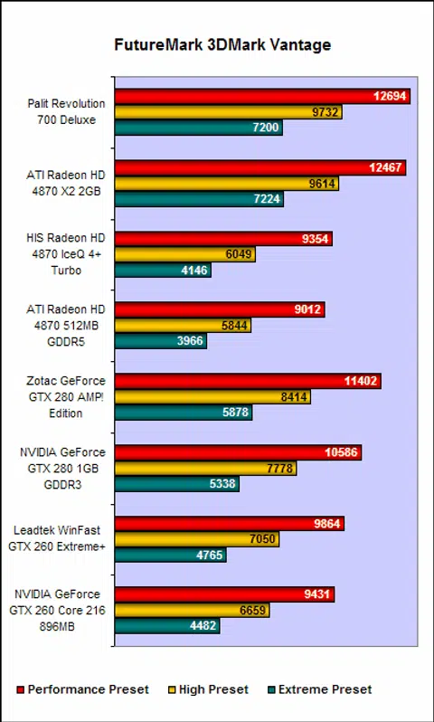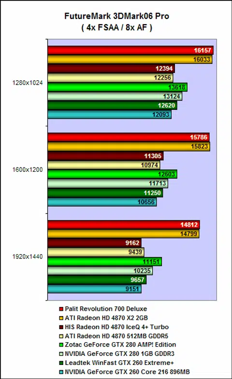 Expectedly, the twin-GPU powered Radeon HD 4870 X2 cards posted the highest scores here, with scores reaching a stratospheric 16,000 plus 3DMarks. They were, by far, the fastest cards. And as evident here, the nominal memory overclock on the Palit Revolution 700 Deluxe did little to boost its scores over a standard Radeon HD 4870 X2. Elsewhere, everyone else was pretty much equal, but the Zotac GeForce GTX 280 AMP! Edition did pull ahead when we upped the settings.