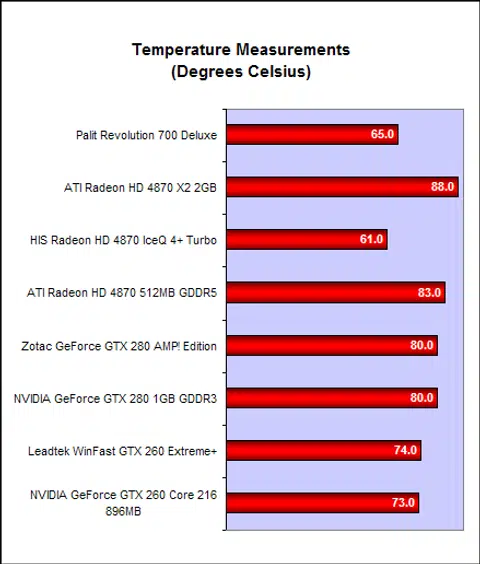 ATI's dual-GPU monsters are exceptionally hot cards and this was demonstrated by the reference Radeon HD 4870 X2, which tipped the scales at a whopping 88 degrees Celsius. And fortunately for the Palit Revolution 700 Deluxe, while it wasn't a top performer, its triple-slot cooling solution did not let it down as it recorded a very impressive 65 degrees Celsius. That's a mammoth 23 degrees Celsius reduction in operating temperatures! This comes at a price of course, as the two fans on the Palit Revolution 700 Deluxe wasn't particularly quiet, and because it is a of a triple-slot design, it does mean that the card takes up a lot of real estate, which can be bad news for those with small casings or those that can't easily take in multi-slot peripherals.