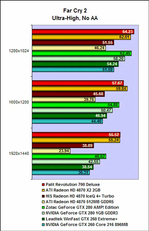 Palit Revolution 700 Deluxe | R700 (RV770 x 2) | 750MHz | 320 Processors (1600 Stream processing units) | 750MHz | 3800MHz GDDR5 | 256-bit | ~US$565 |