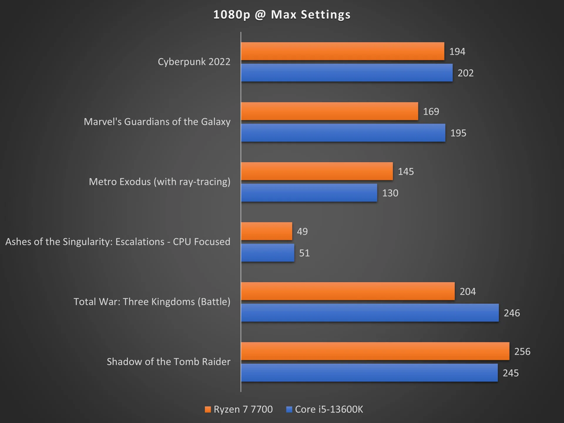 Just look at the chart below: The AMD Ryzen 7 7700's gaming performance at 1080p is not far from the more powerful (and expensive) Ryzen 7950X3D, and costs less than half the price of AMD's flagship processor. Here's a brief snapshot of results below.