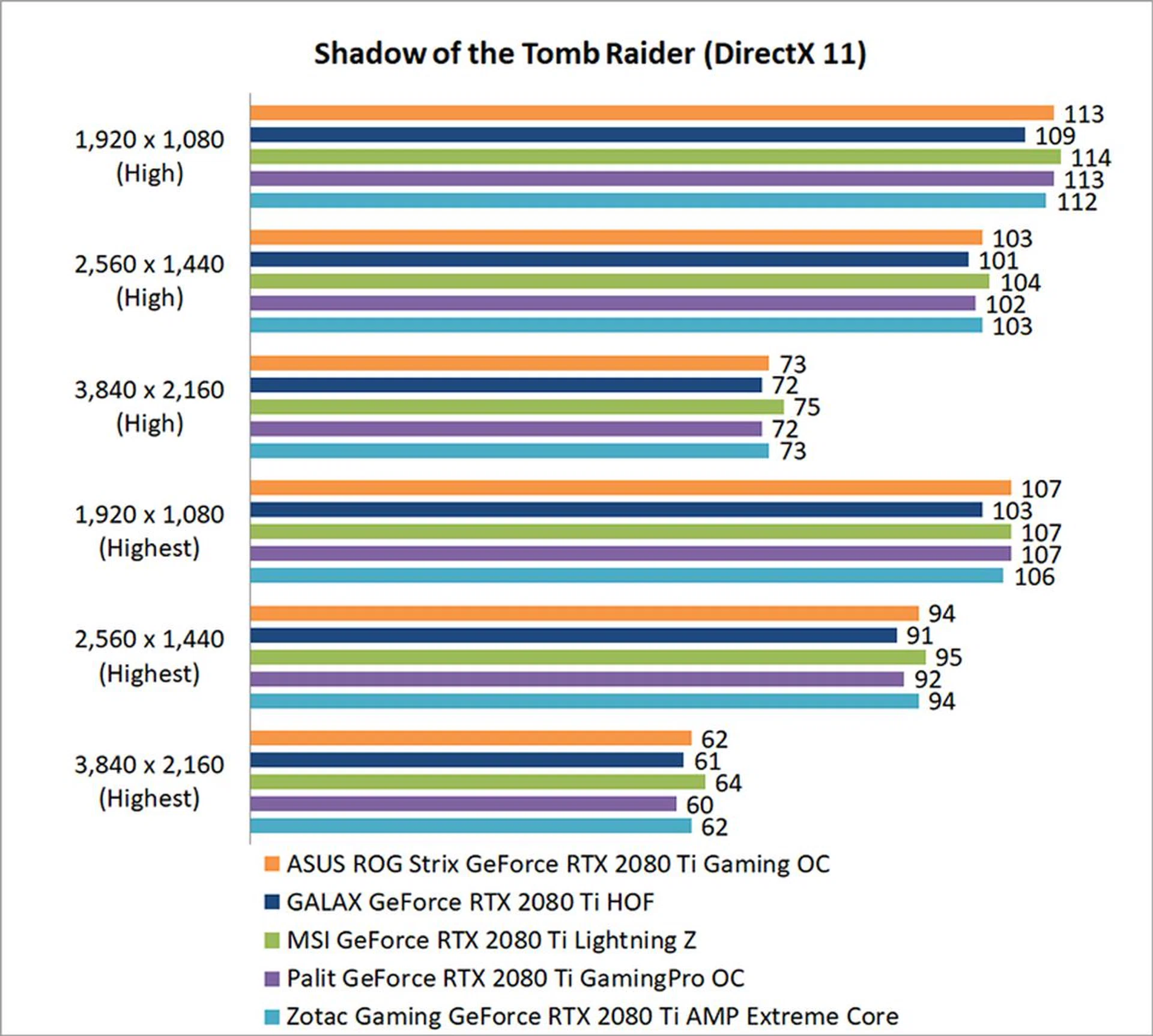 ASUS ROG StrixGeForce RTX 2080 Ti Gaming OC | GALAX GeForceRTX 2080 Ti HOF | MSI GeForce RTX 2080 Ti Lightning Z | Palit GeForce RTX 2080 Ti GamingPro OC | Zotac GeForce RTX 2080 Ti AMP Extreme Core | |