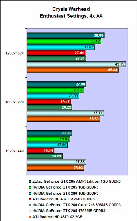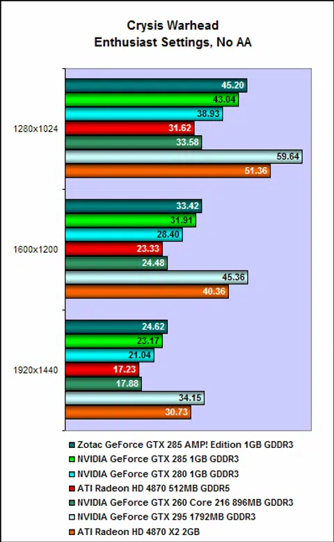 Coming to real world benchmarking with Crysis Warhead, the Zotac GeForce GTX 285 AMP! Edition certainly didn't disappoint, recording frame-rates that were comfortably above the playable 30fps threshold up until anti-alising was activated. The regular GeForce GTX 285 didn't do too bad either, delivering on NVIDIA's promise of 10% performance increases over the older GTX 280.