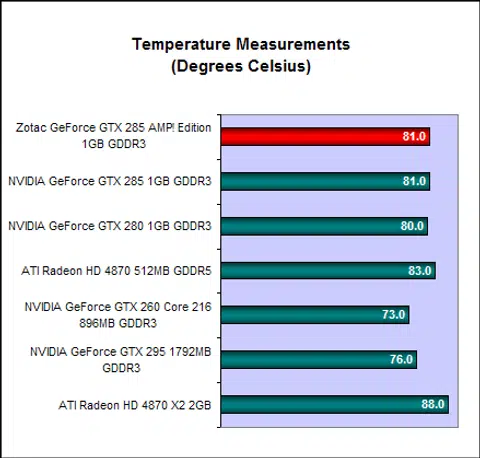 NVIDIA claims that thanks to the GeForce GTX 285's new 55nm manufacturing process, the new cards will not only run faster, but also cooler. Sadly, our results show otherwise. At 81 degrees Celsius, it about as hot as the older GTX 200 cards and is even warmer than the twin GPU GeForce GTX 295. We said this many times before and we'll say it again, the cards from the GTX 200 series are desperately crying out for a new cooler. Still, credit must be given where credit is due, and we must say that the cooler on the Zotac GeForce GTX 285 AMP! Edition was surprisingly smooth and quiet.
