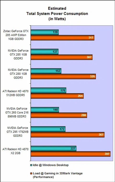 NVIDIA promises the new GeForce GTX 285 to use about 20W less power and as you can see from the graph, our findings wholly supports that claim. Naturally, being factory-overclocked, the Zotac GeForce GTX 285 AMP! Edition requires even more juice to run. Having said that, we were particularly impressed with how NVIDIA has managed to bring down their cards' idle power consumption to such low levels.