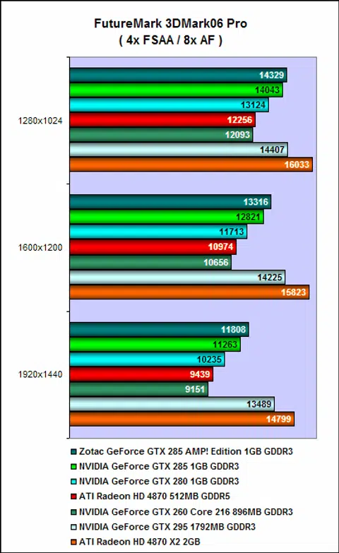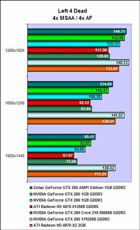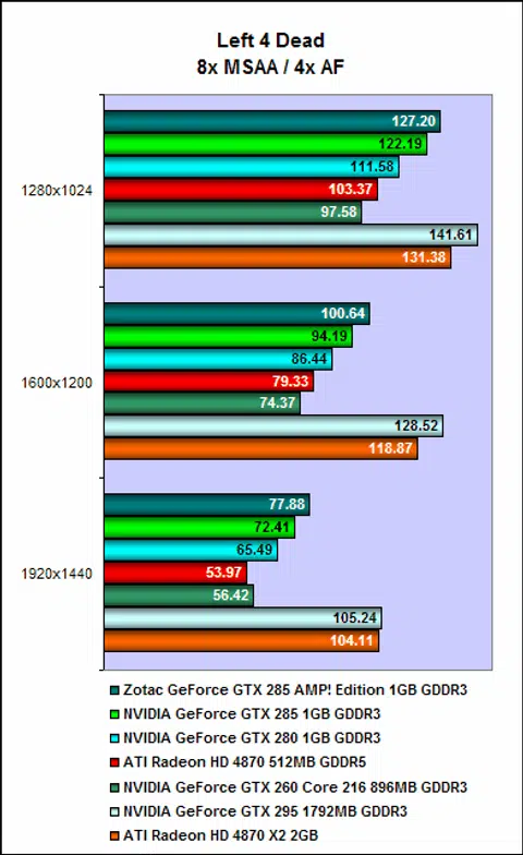On Left 4 Dead, the Zotac GeForce GTX 285 AMP! Edition was so fast that it could even challenge the Radeon HD 4870 X2 on the lower resolutions. The regular GTX 285 again showed sizeable performance gains over the GTX 280.