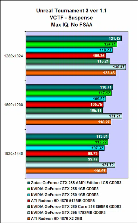 Coming to Unreal Tournament 3, the Zotac GeForce GTX 285 AMP! Edition stood out for having frame-rates that surpassed even that of the ATI Radeon HD 4870 X2. However, it must be noted that Unreal Tournament 3 generally fares better on NVIDIA cards, so maybe that could explain the Zotac's blazing performance.