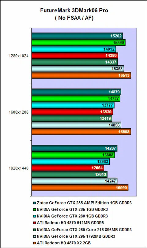The new GeForce GTX 285 strutted its stuff right from the get-go, posting 3DMark06 scores that were about 5-10% higher than the GTX 280. Needless to say, the factory-overclocked Zotac GeForce GTX 285 AMP! Edition recorded even higher scores that could almost rival that of the dual-GPU GeForce GTX 295. Clearly, performance on 3DMark06 for the GeForce GTX 295 doesn't scale very well, reminding us that dual-GPU cards are only as good as the drivers that drive them. It also easily left ATI's fastest single GPU card, the Radeon HD 4870, in the dust.