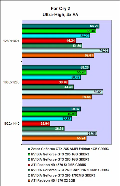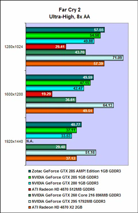 On Far Cry 2, the Zotac GeForce GTX 285 AMP! Edition and regular GTX 285 both managed to put up very playable frame-rates even on our highest settings. The same, however, cannot be said of the Radeon HD 4870 which began to stutter badly when we turned the quality of anti-aliasing up to 8x. Clearly, 512MB is not enough if you wish to play games at the highest settings.