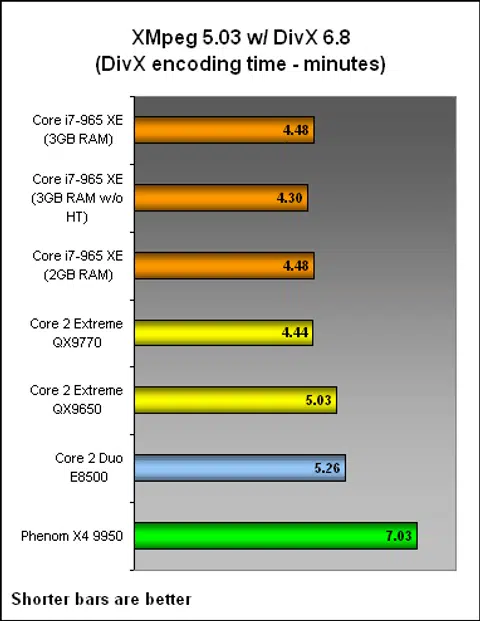 With Cinebench 10 capable of using multiple cores and threads to improve its scores, the SMT enabled Core i7 was primed to top the charts. Simulating 8 cores, the Core i7 took a 24% lead over the QX9770. However, when it came to a more realistic application like DivX encoding using XMpeg, the Core i7 was just about equal with the QX9770, with HyperThreading again having a say on the results.