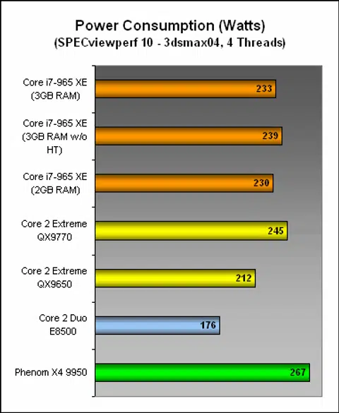 When running at peak in both 3DMark06 and SPECviewperf 10, the Core i7 consumed marginally less power than the QX9770, though turning off SMT had rather contradictory effects on the power consumption numbers. Again, it does look like SMT has quite the impact, even here for the power consumption testing and it depends very much on the actual workload, with the SPECviewperf test probably utilizing the SMT more fully.
