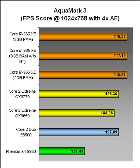CPU scores were as expected higher in AquaMark3 for the Core i7, with this lead extending into the overall FPS scores.