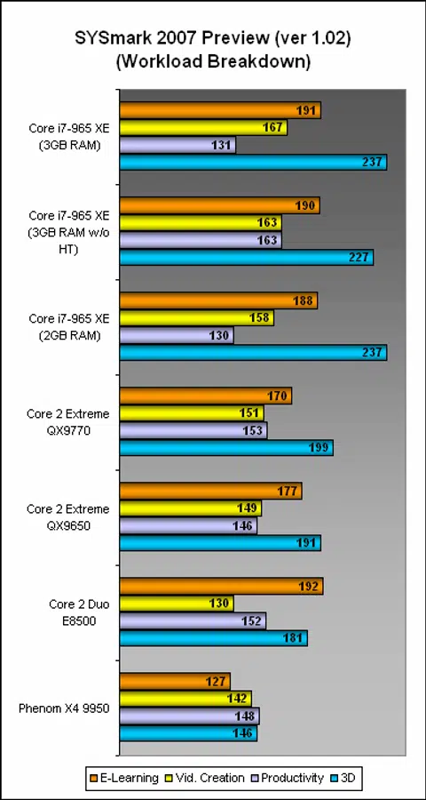 SYSmark 2007 will give more ammunition to those who believe that HyperThreading is a double edged sword because once we disabled it, the Core i7 scores were higher. Looking at the breakdown, 3D and video creation benefited most from having SMT enabled but this was countered with a drastic drop in scores for the productivity segment.