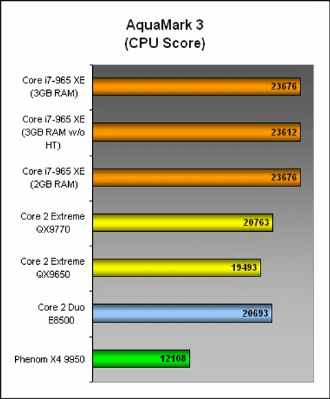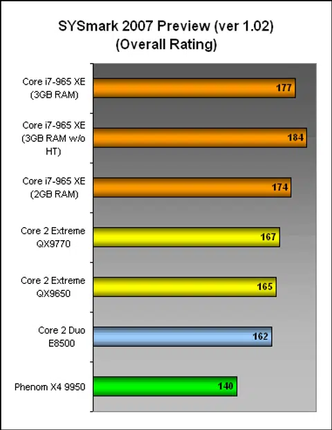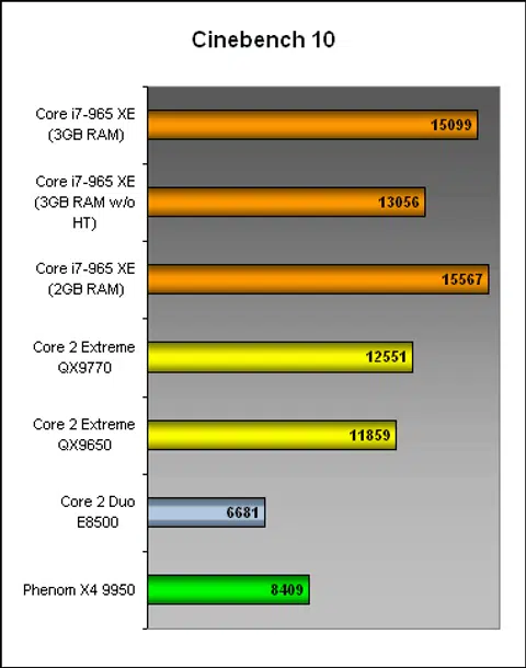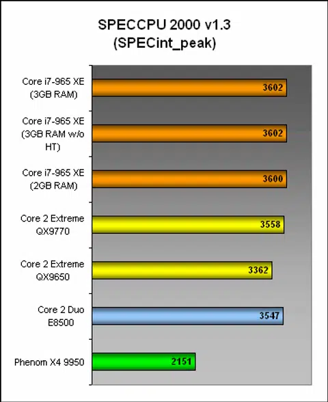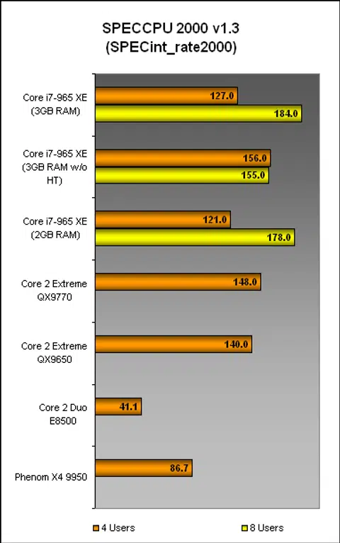 To examine how the revived HyperThreading (SMT) performed, we tested the Core i7-965 with and without this feature enabled. We also tweaked the amount of memory used to 2GB of DDR3-1333 at the same memory timings so that it will be comparable in terms of memory size to our older test results for the Intel Core 2 Extreme CPUs and Phenom CPUs that we will be comparing the Core i7 against. This last set also examines if the additional memory controller actually has any beneficial effect to overall performance. Hence, there will be three sets of results involving the Core i7-965 Extreme Edition.