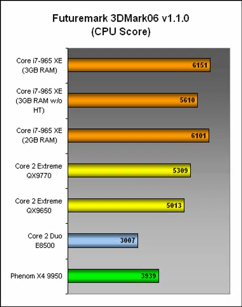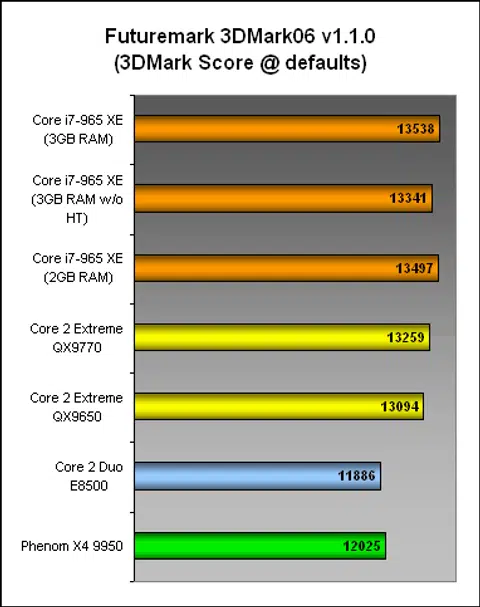 The CPU segment in 3DMark06 benefited significantly from having SMT enabled but in terms of the overall score, there was hardly any difference between the new Core i7 and the Core 2 Extreme QX9770.