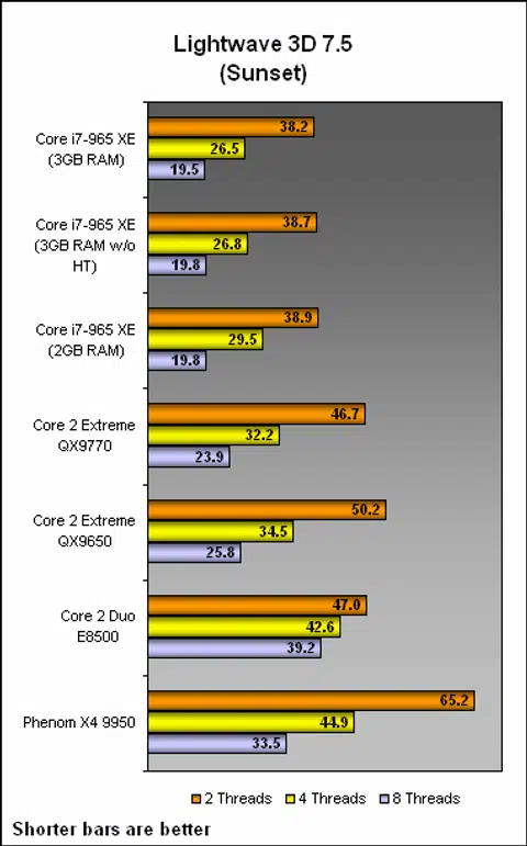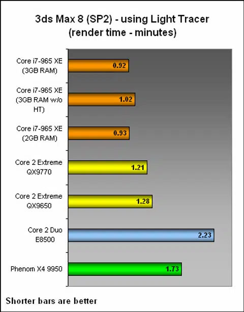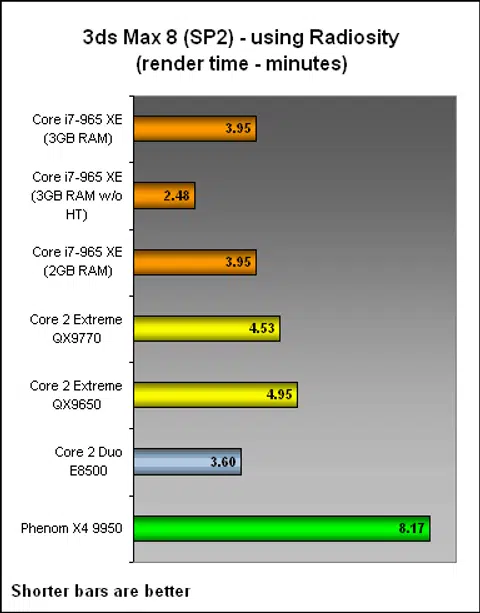 Once again, the 'unpredictability' of Core i7's SMT is in the limelight here. With 2 different test scenarios in 3ds Max 8, having SMT appeared to be a liability for Radiosity while the reverse was true for Light Tracer. The amount of memory (3GB vs 2GB) did not seem to have any effect on the final results for the Core i7 and in both tests, with or without SMT enabled, the Core i7 was ahead of the Core 2 Extreme. We also had a rather anomalous result in Radiosity, with the Core 2 Duo E8500 outperforming every other CPU.