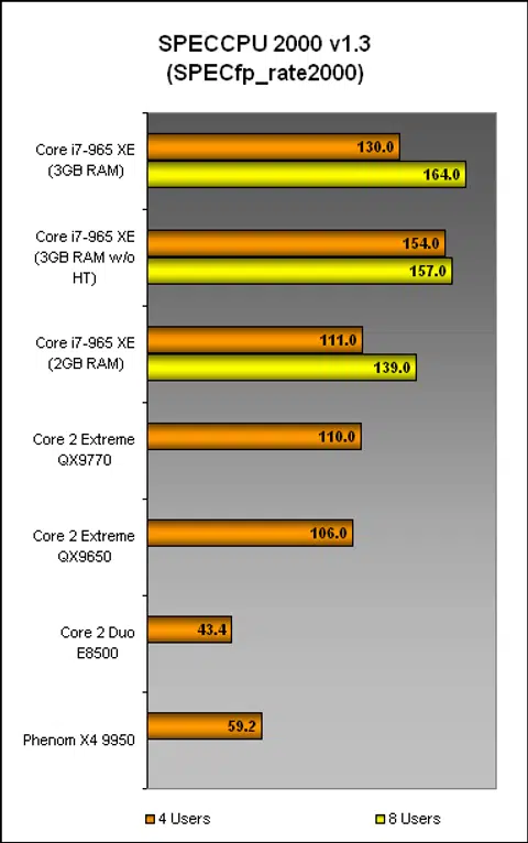 HyperThreading or SMT as Intel now calls it, can be a mixed blessing for the Core i7. It looked to be heavily dependent on the workload, with it pulling back the Core i7 at the 4-user test scenario, though it turned out to be very useful when 8 users were chosen. In fact for SPECint_rate, having HT enabled produces higher scores than without, even with 1GB less memory. The catch of course is to have the 8 users test scenario and not 4 users. As we have mentioned in the past, the performance of HT is dependent on the application/OS picking the right core to send the workload (two different logical cores as seen by the OS may in fact belong to the same physical core). As such, for normal everyday usage, HT is really not necessary and in fact might be a hindrance as seen from our results.