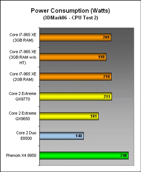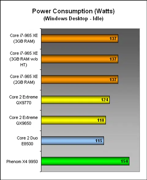 Before we talk about the power consumption results, we have to say that we were unable to get the Core i7 and the X58 motherboard to enter the idle state. We didn't notice any frequency or power throttling when idling in desktop like the other Core 2 Extreme CPUs. As a result, the 'idle' results returned by the Core i7 were all higher than the other Intel processors, though the AMD Phenom still took the unwanted tag of being the most power hungry CPU.