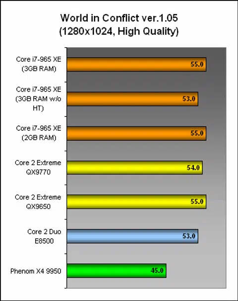 Onto our gaming benchmarks, where HyperThreading had a slight impact in World in Conflict, though Crysis was unaffected. There was also not much of a boost in frame rates, rather Crysis saw a slight drop for the Core i7, putting it on par with the dual-core E8500. This was despite the fact that Crysis was able to take advantage of 4 or more threads but we didn't see any of that happening. We'll be trying these tests again shortly with a more powerful graphics card than the GeForce 8800 GT we're using here, but we doubt we'll see a lot of difference because the resolutions and settings used are quite tame and shouldn't bottleneck the GPU that soon. Stay Tuned for an update on this.