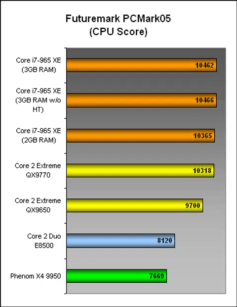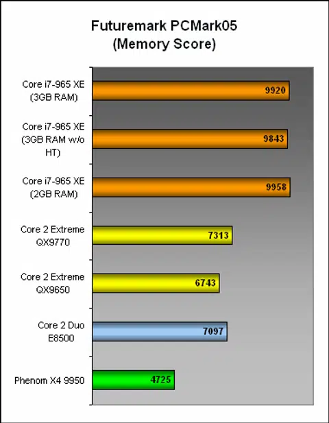 There wasn't any dramatic improvements in PCMark05's CPU score for the Core i7 as the 3.2GHz Core i7-965 Extreme Edition had only marginally higher numbers than the Core 2 Extreme QX9770. There was also negligible difference between the scores for the three Core i7-965 configurations. In the memory segment however, the new architecture flexed its muscular bandwidth with a staggering 35% gain over the QX9770. Here, there was a slight dip in performance once HyperThreading was disabled, but it was still significantly faster than the previous platforms using Core 2, which directly relates the advantages of the integrated memory controller.