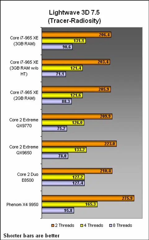 The Core i7 was generally faster than its closest rival, though there were occasions when HT again seemed to be the culprit affecting its performance. For instance in the Tracer-Radiosity test, turning off HT yielded slightly better results for all scenarios, while having it enabled meant that the QX9770 was actually doing better for 4 and 8 threads, even with its 1GB RAM disadvantage.
