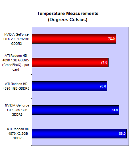 While the two cards' performance was pretty similar, there were marked difference in the card's temperature and power consumption readings, and also their overclocking abilities. At 71 degrees Celsius at the core, the Radeon HD 4890 is already a very warm card, and with two in the casing, our test system felt significantly warmer.