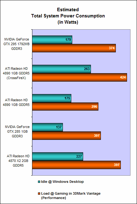 Also, these are by no means green cards, and the readings show. The GeForce GTX 295 clocked a maximum power consumption reading of 374W for the entire system, while the pair of XFX Radeon HD 4890 cards showed a much higher power consumption of 424W. The two Radeon HD 4890 cards also recorded a very high idle power draw of 263W. The NVIDIA GeForce GTX 295, on the other hand, had an idle system power draw of just 179W, which is remarkably lower.