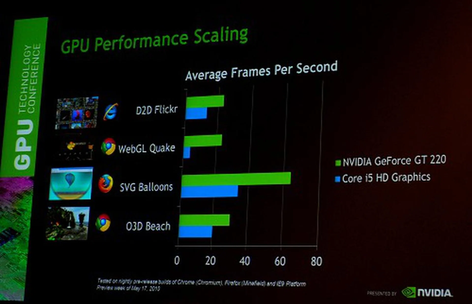 Now that's a resounding yes! Some experts would have course next point out that this would mean a varying level of web experience and performance across various systems for everyone. Think of it this way - currently, the more platform performance you have, the greater your applications and sometimes even your internet experience improves. The only different is that now, hardware accelerated graphics support on browsers will tap on to the GPU as well. Here's a couple more slides from NVIDIA on their performance findings at this point of time:-