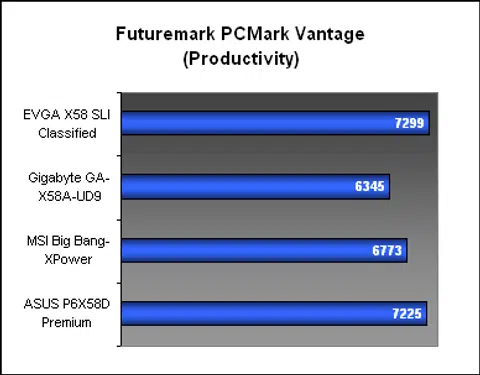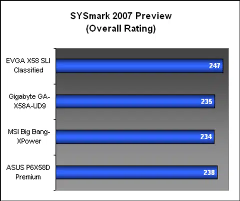 With a strong showing in the Productivity segment, the EVGA was the fastest board in our SYSmark 2007 benchmark. The other boards posted mostly similar scores and were on a SATA 6Gbps hard drive, which appears to be the main difference between these boards and the EVGA. Looks like non-native SATA 6Gbps isn't really a positive experience.