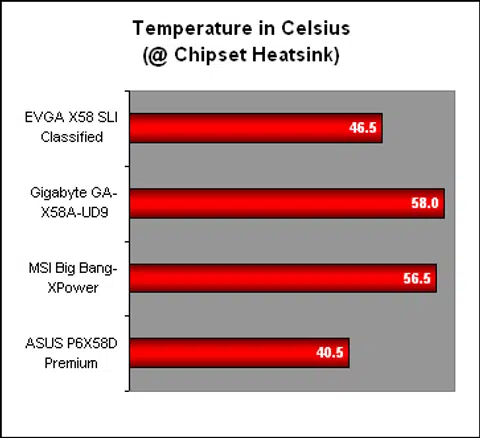 The Gigabyte UD9 with its rather large heatsink also happened to be our warmest board, with almost 60 degrees Celsius recorded. The MSI board wasn't too far behind though. Meanwhile, the EVGA and ASUS boards both had relatively cool temperatures; for the EVGA, the extra fixed radiator probably helped (we did not install the Hybrid Silent Pipe on the Gigabyte, which should have a similar effect for the Gigabyte's chipset temperature) to keep it below 50 degrees.