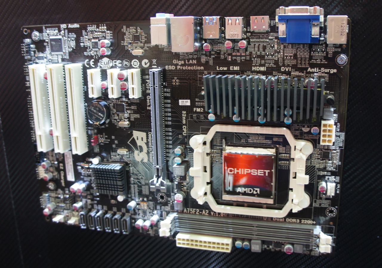 This ATX board features the AMD A75 chipset and has only a pair of DIMM slots that can support up to 32GB of DDR3-1866MHz memory modules.