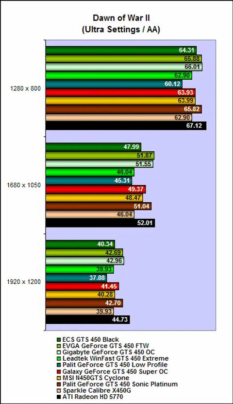 On Dawn of War 2, EVGA and Gigabyte cards was once again inseparable in terms of performance. From the graphs, we can see that ECS card was marginally quicker than the Leadtek card, but in reality the difference was only about 1% to 2%. Again, the reference clocked low profile Palit card rounded up the pack. With its reference clock speeds, it’s simply no match for the other factory overclocked cards.