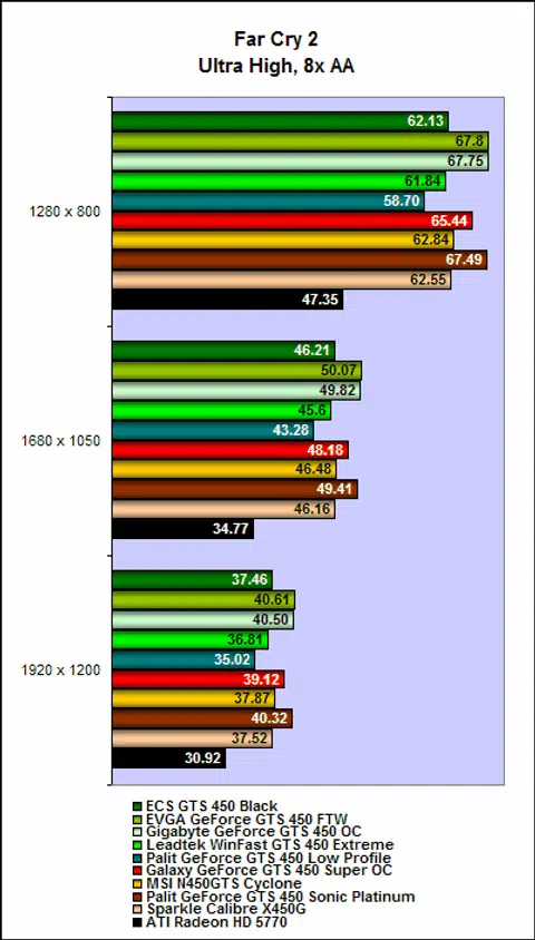 On Far Cry 2, it was once again a tough fight between the EVGA and Gigabyte cards. It seems that whatever deficit the EVGA has in core clock speeds is made up for by its faster clocked memory. The ECS and Leadtek cards was once again very comparable, and the low profile Palit card, because of its reference clock speeds, was the slowest of the lot.