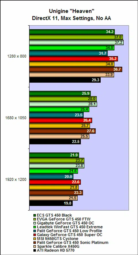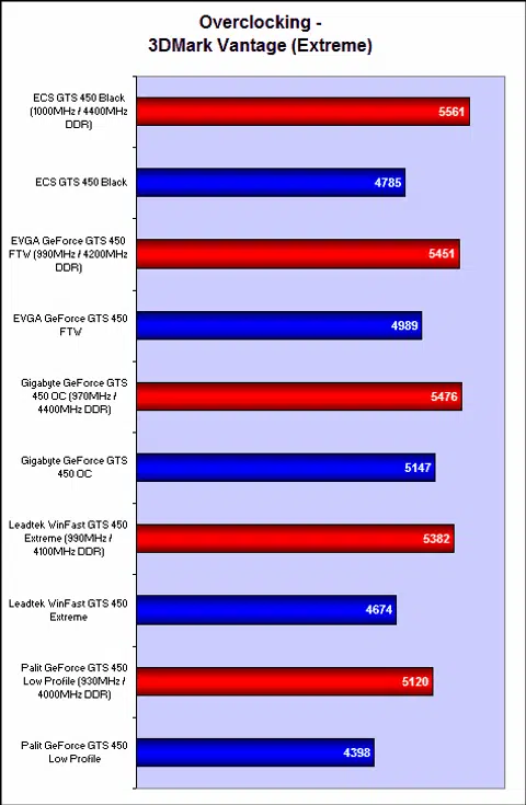 The GF106 chip is an eager overclocker and our collection of cards did admirably in our overclocking tests, and taking top honors was the ECS GTS 450 Black. With its massive cooler and cool operating temperature, we managed to run the ECS GTS 450 Black stably at a full 1000MHz at the core and 4400MHz DDR at the memory. This gave us a considerable 5561 3DMarks, an improvement of 16%.