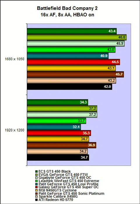 It’s more of the same on Battlefield Bad Company 2, with the EVGA and Gigabyte cards still inseparable in terms of performance. It was a close fight between the ECS and Leadtek cards too, although the ECS card can be said to be marginally quicker.