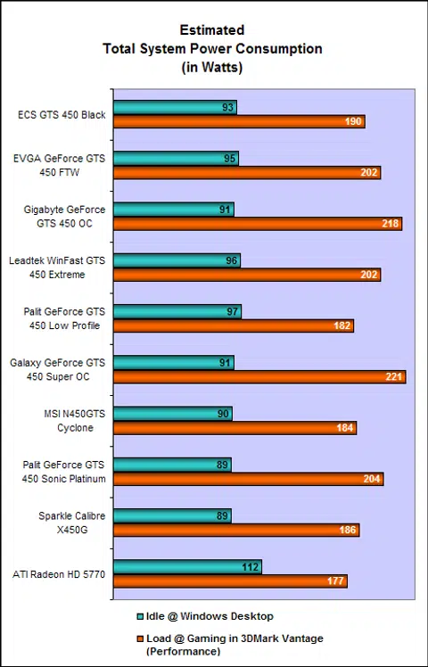 Power readings of all five cards were more or less inline with our expectations. Although all cards recorded comparable readings at idle, the Gigabyte GeForce GTS 450 OC stood out for its slightly higher than average reading at load, which is not entirely surprisingly given its high clock speeds. In the same vein, the reference clocked Palit GeForce GTS 450 Low Profile recorded the lowest power draw readings at load amongst all the GeForce GTS 450 cards.