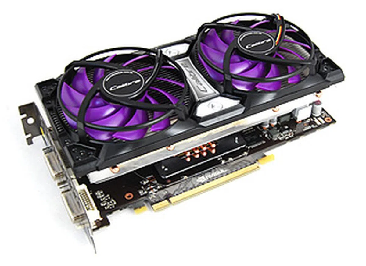 The Sparkle card has an even larger cooler than the Gigabyte card. The Accelero Twin Turbo PRO cooler takes up two and a half expansion slots and has an elaborate heatsink array for better heat dissipation.