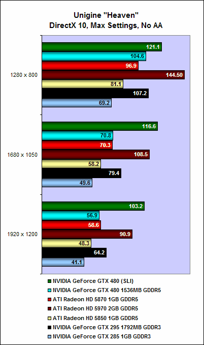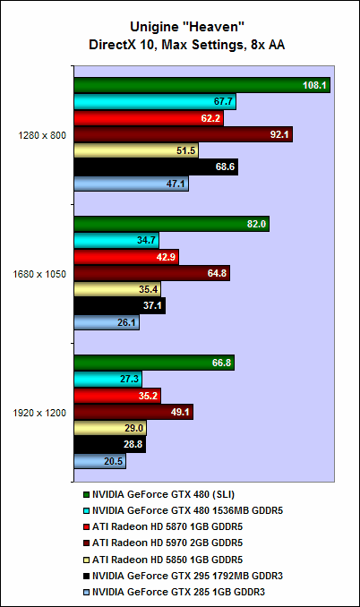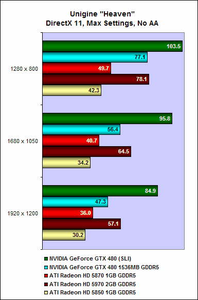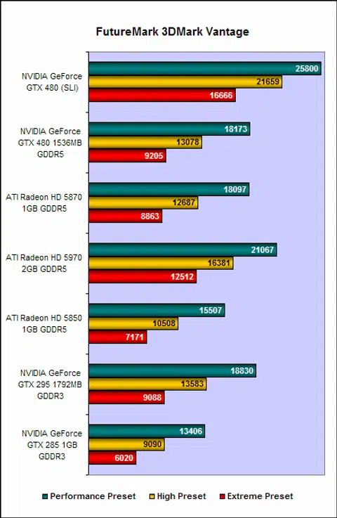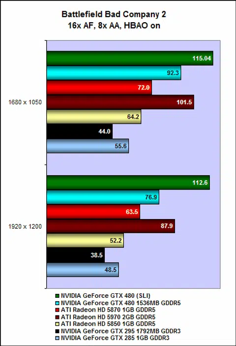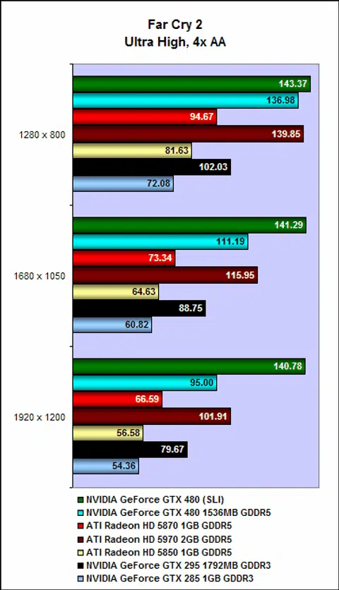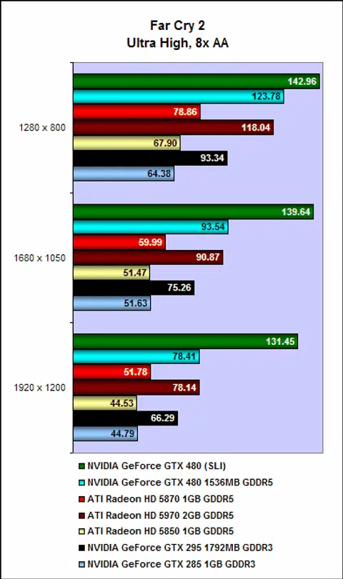 The GeForce GTX480 in SLI is also substantially faster than anything in ATI's stable. Even the Radeon HD 5970 could not cope with the sheer might of two GeForce GTX 480 cards, and if a dual-GPU "GeForce GTX 495" does come to fruition, it will surely, barring any major catastrophe, seize the title of fastest single graphics card from the Radeon HD 5970.